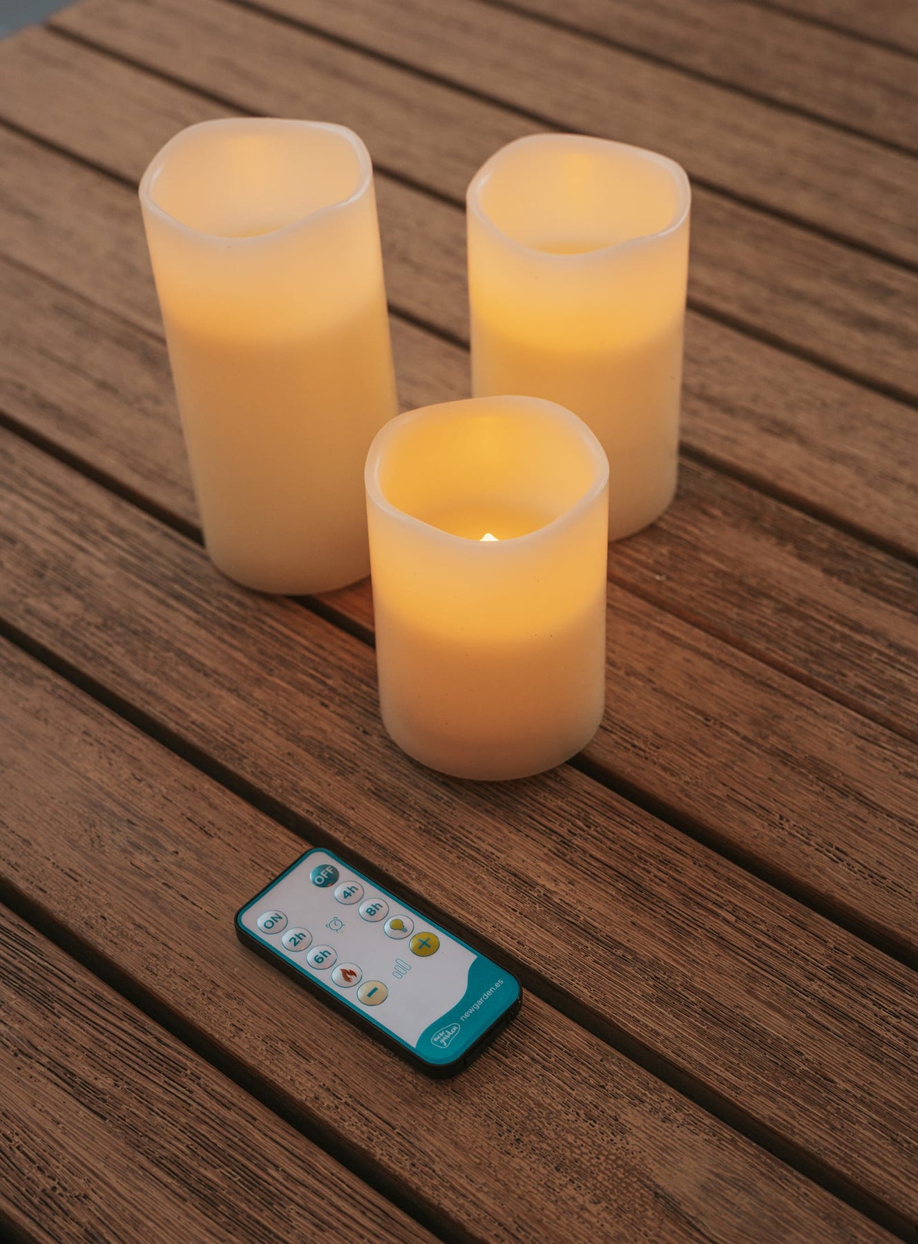 Yes. Dolo candles are rated IP44 for indoor and outdoor use. For outdoor placement, they should be protected from direct sunlight, as natural wax may change shape under prolonged heat.